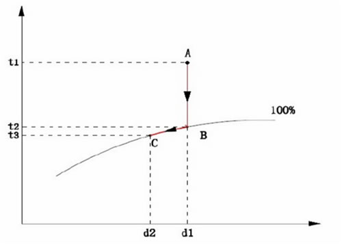 過熱狀態(tài)A冷卻至飽和狀態(tài)B,飽和狀態(tài)B繼續(xù)冷卻至飽和狀態(tài)C。由A至C過程中,含濕量由d1降到d2。