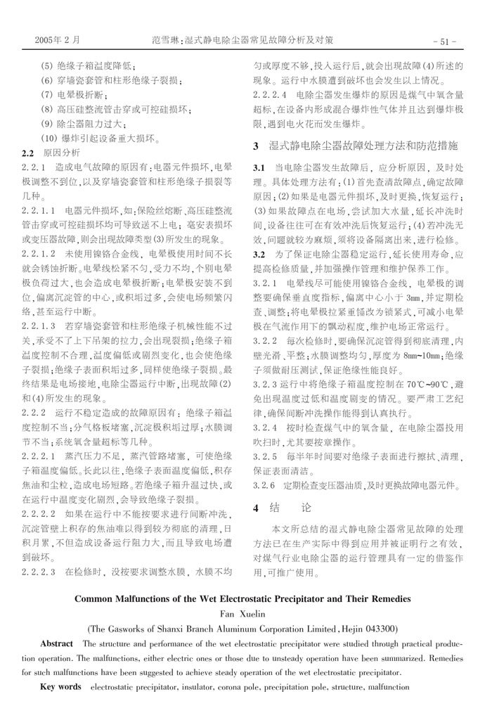 本論文研究了濕式靜電除塵器的結(jié)構(gòu)和性能,根據(jù)生產(chǎn)實踐歸納了濕式靜電除塵器在運行中經(jīng)常出現(xiàn)的故障,包括電氣故障和運行不穩(wěn)定造成的故障,并對故障原因進行了分析,提出了處理方法和預防措施,以便達到提高濕式靜電除塵器運行穩(wěn)定性的目的。